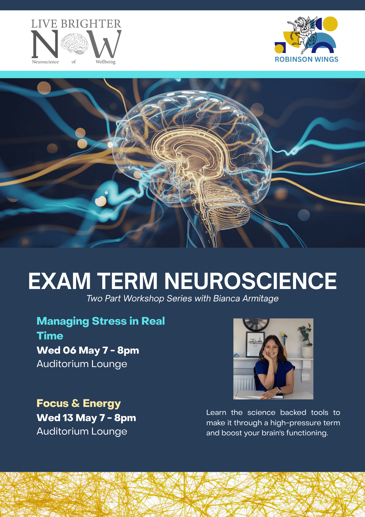 Join for a workshop led by Neuroscience of Wellbeing Consultant Bianca Armitage. You'll learn the science backed tools to manage your stress in real time, helping you make it through a high-pressure term and boost your brain's functioning.