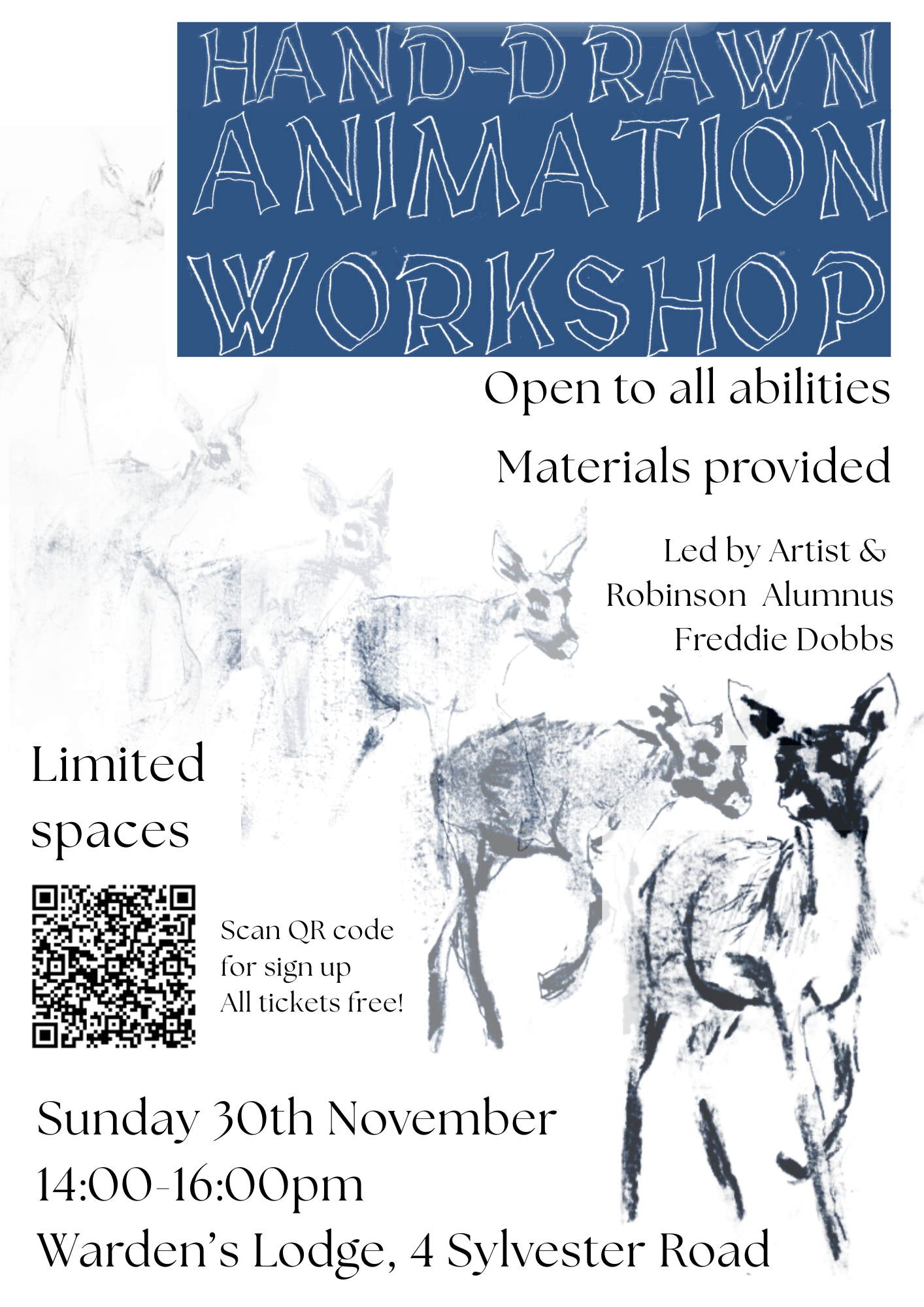 Learn how to make a hand-drawn animation with artist & Robinson alumnus Freddie Dobbs. Open to all abilities & materials provided.