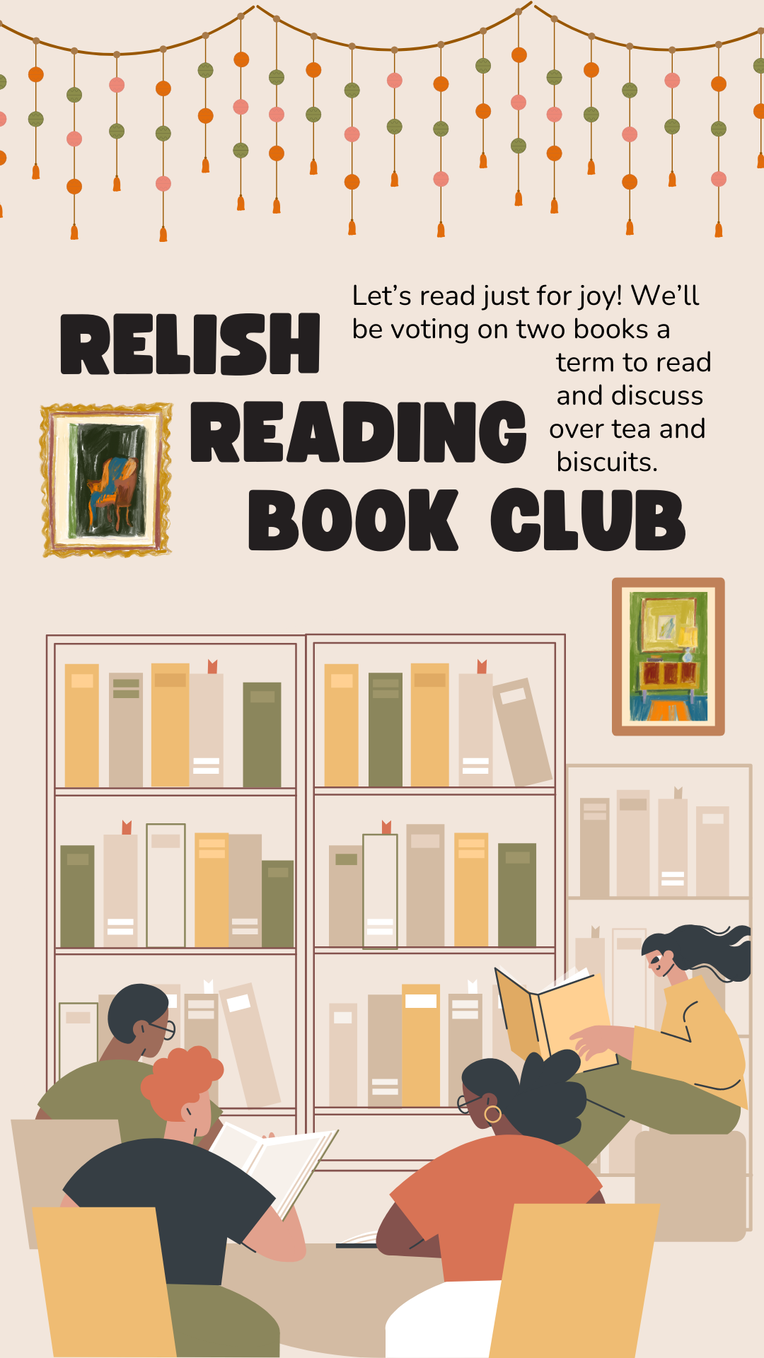 Let’s read just for joy! We’ll be voting on two books a term to read and discuss over tea and biscuits.